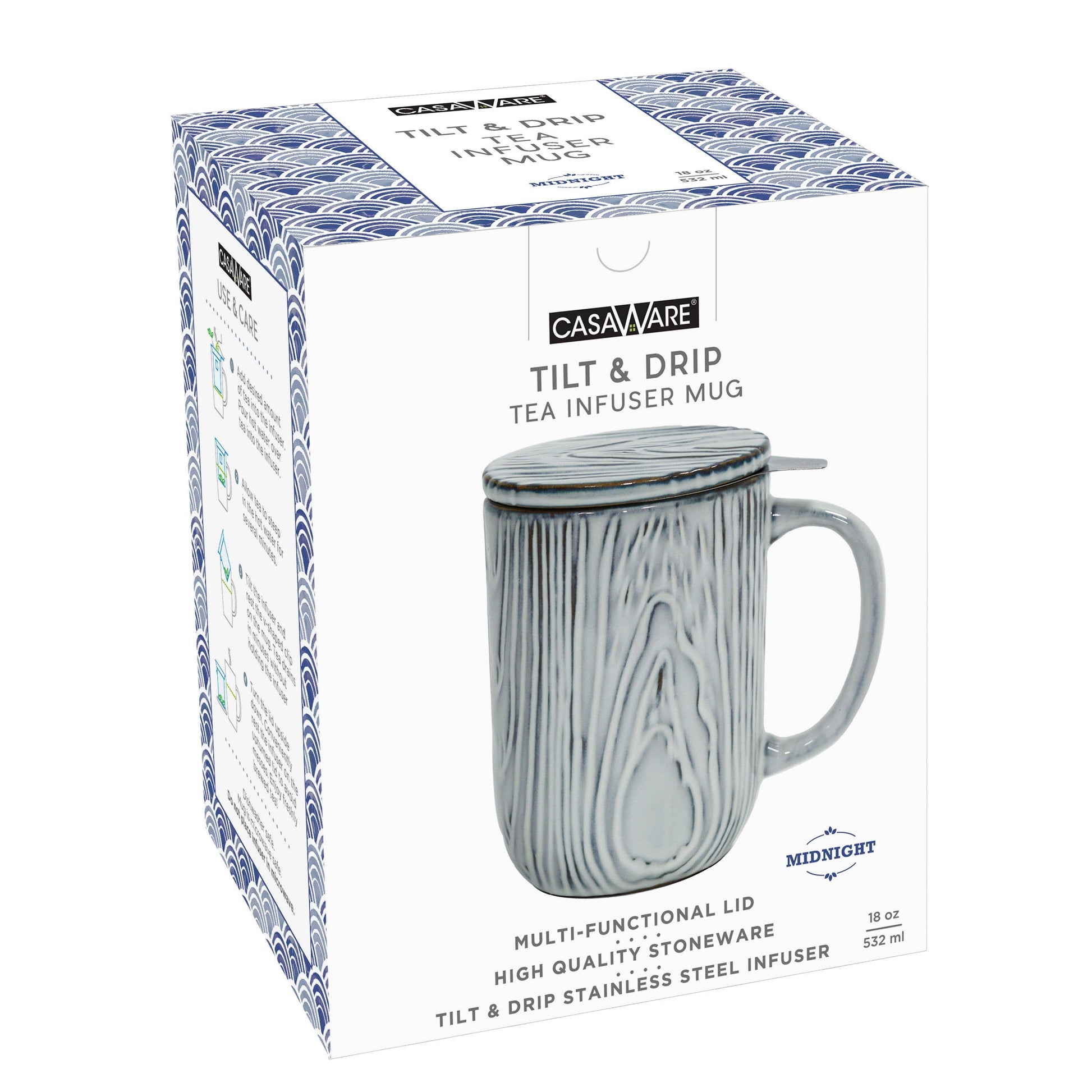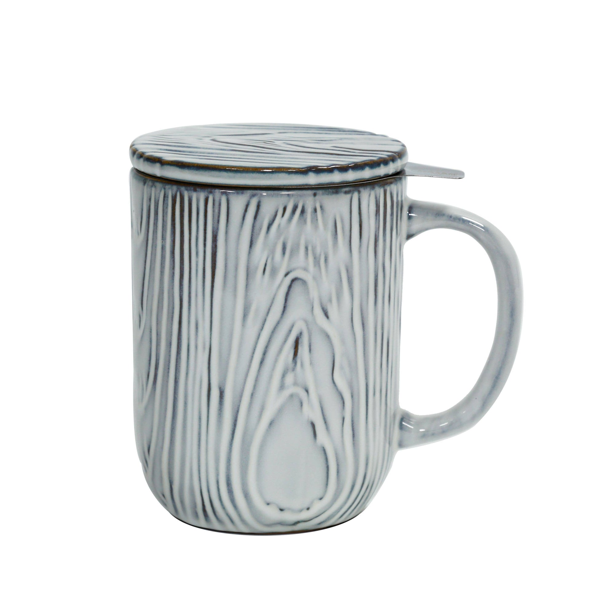 18 oz beautiful stoneware tea infuser mug with a textured woodgrain finish. Includes a stainless-steel fine mesh Tilt & Drip tea infuser. The tea infuser has a V-shaped clip which allows it to rest on the side of the mug so the water can drain from the infuser. The infuser allows good water flow and has plenty of room for the tea leaves to steep. The lid doubles as an infuser holder. The tea infuser mug is dishwasher safe. The mug and lid are microwave safe. The stainless-steel infuser cannot be used in the microwave. BPA free. Available in White, Lava Gray and Midnight.